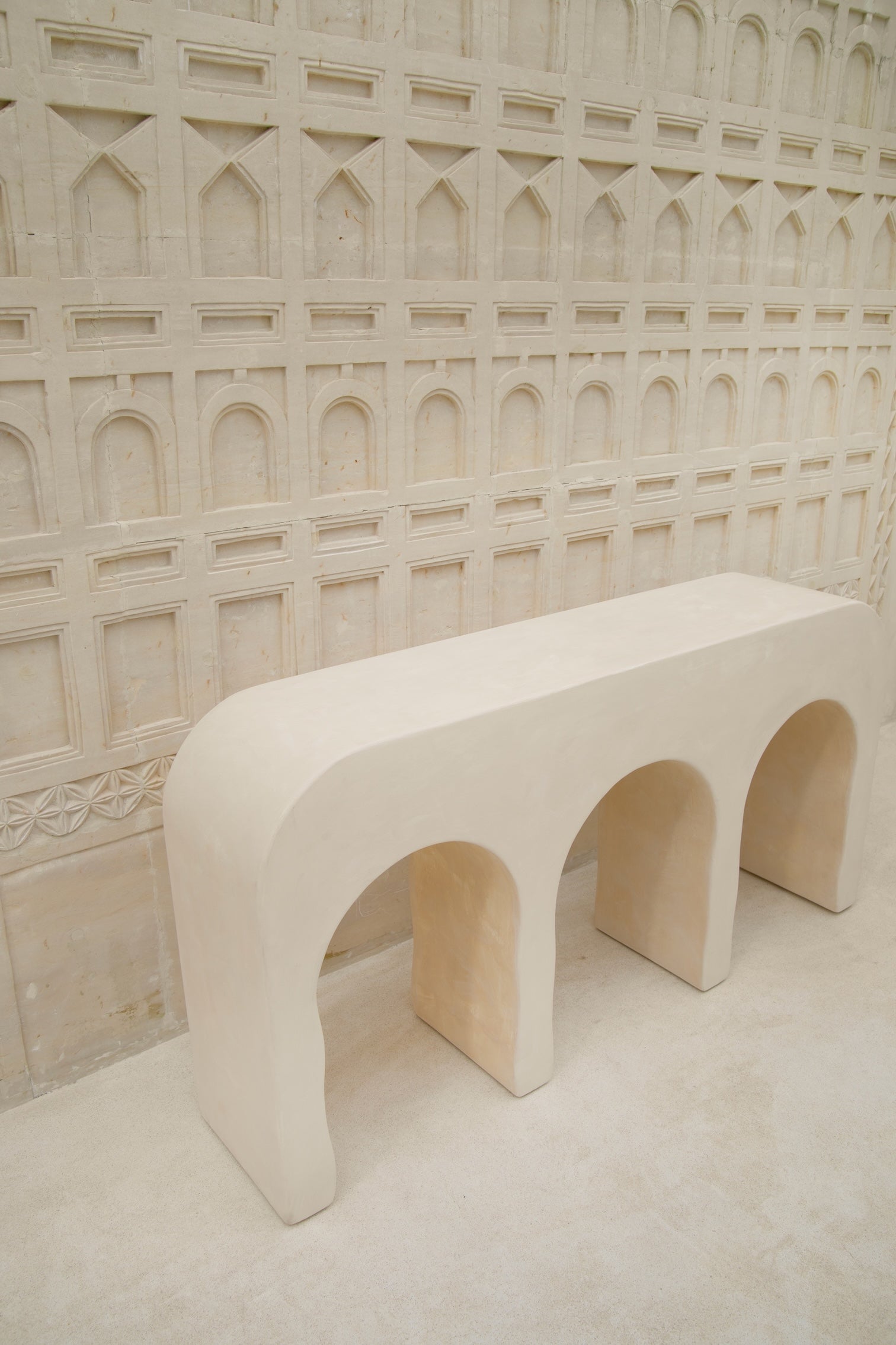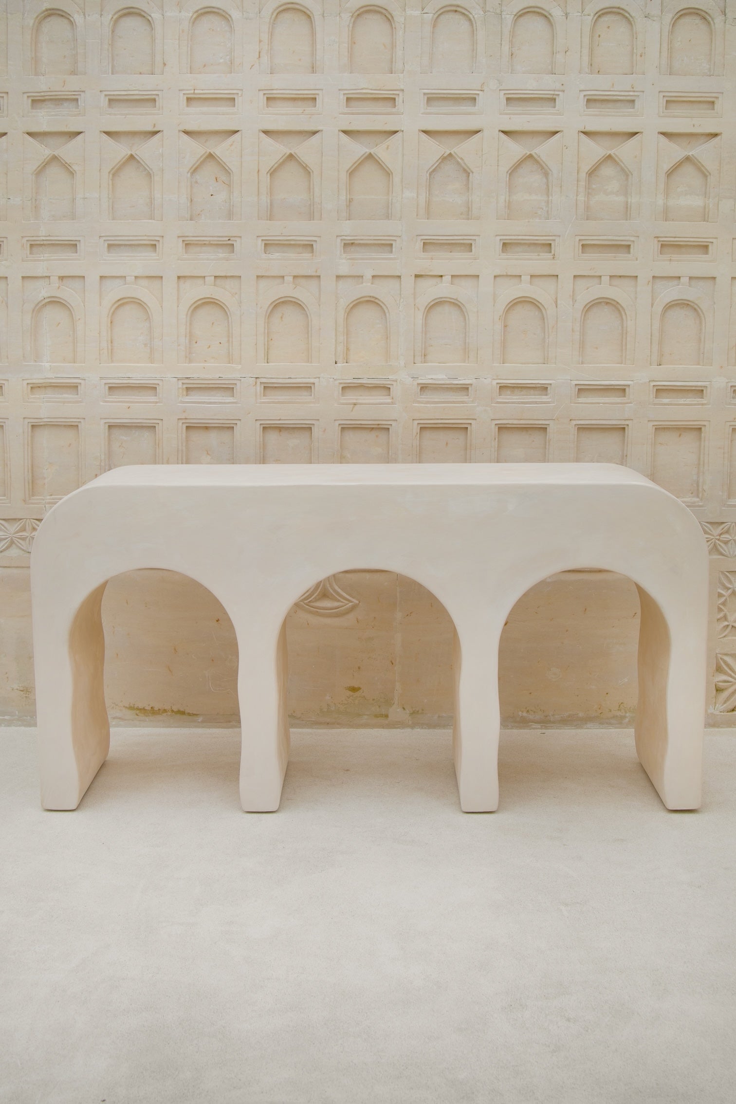 Sculptural and serene, the Santorini Archer Console captures the essence of Mediterranean architecture with its softly curved arches and organic silhouette.