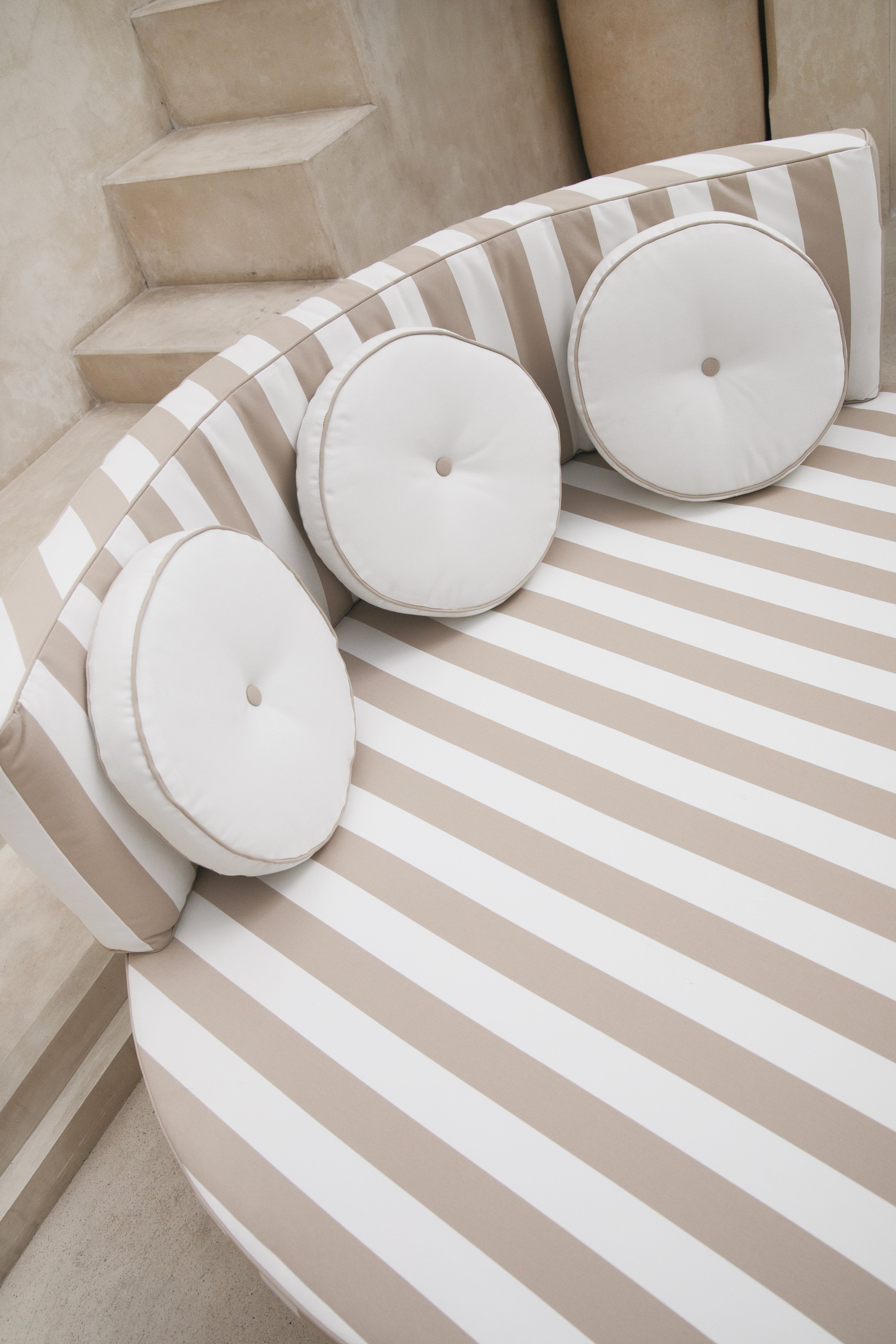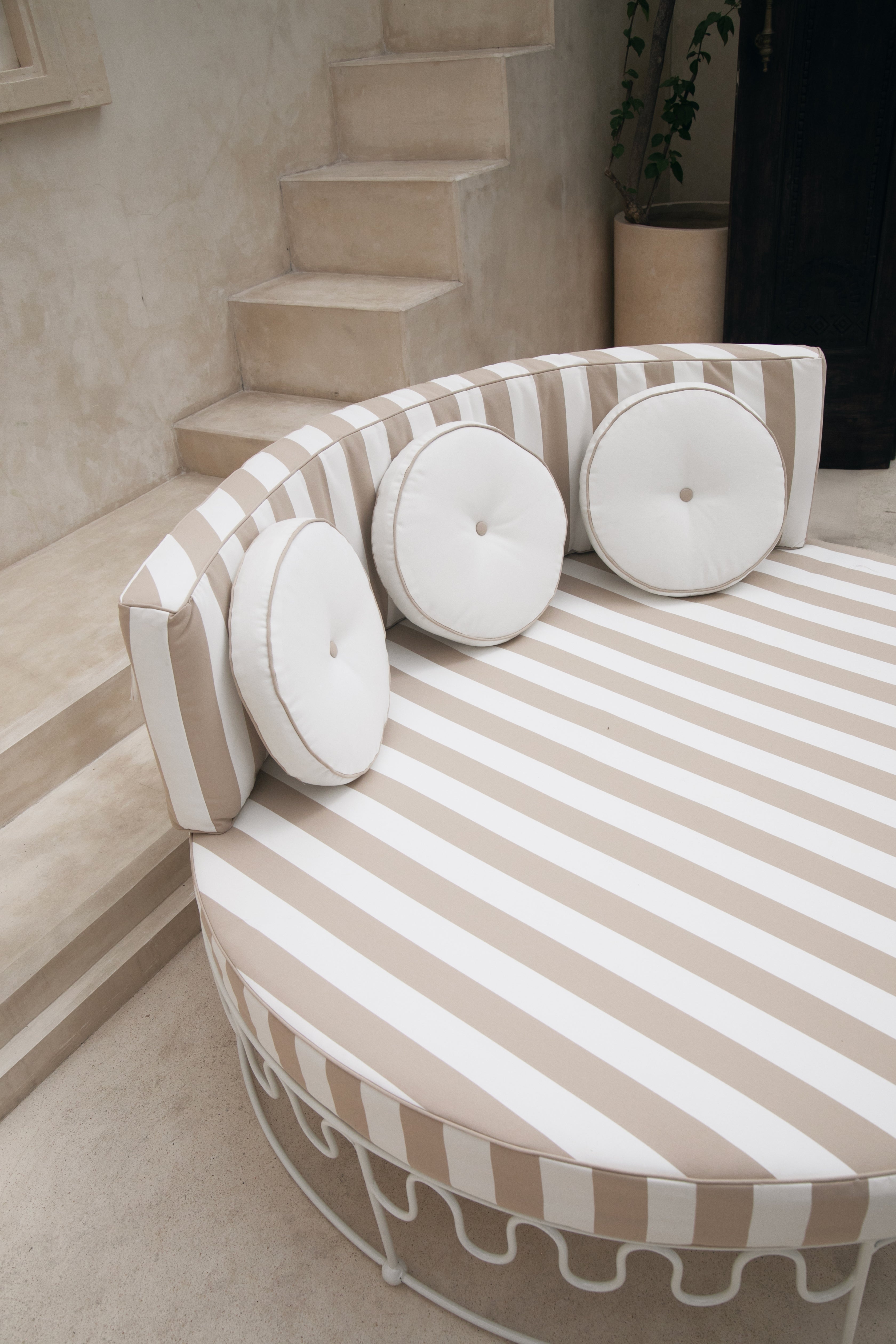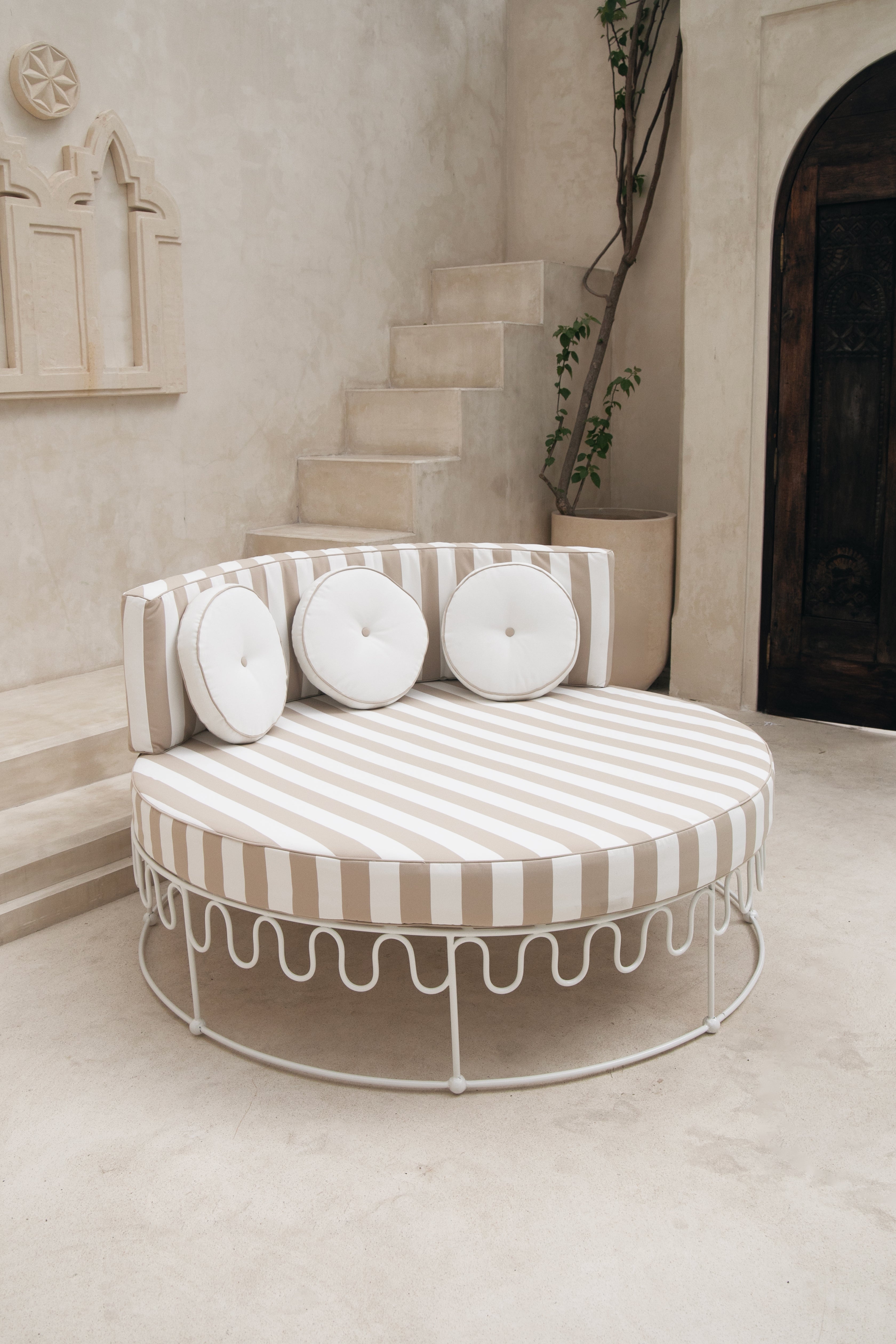 Handcrafted by skilled artisans, each lounger is constructed from a solid iron frame, powder coated for lasting outdoor durability, and paired with generously foam and dacron-filled cushions for a truly cloud-like experience. It comes complete with a plush base and back cushion, including three circular accent cushions, all finished in a waterproof sand stripe fabric. The soft neutral stripe draws inspiration from coastal landscapes and natural textures, creating a warm, relaxed palette that complements the crisp white frame while maintaining Bohteak’s signature resort aesthetic.