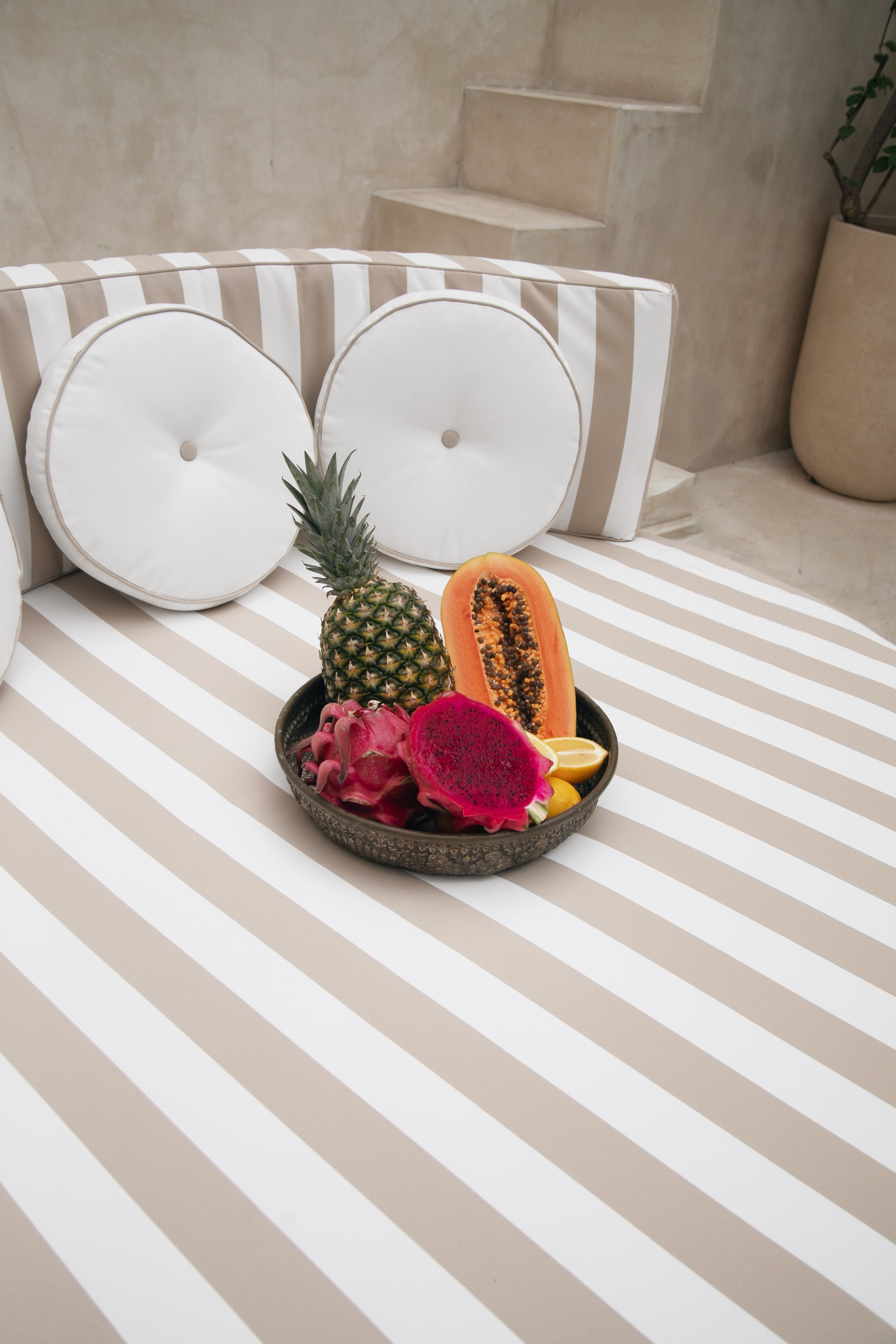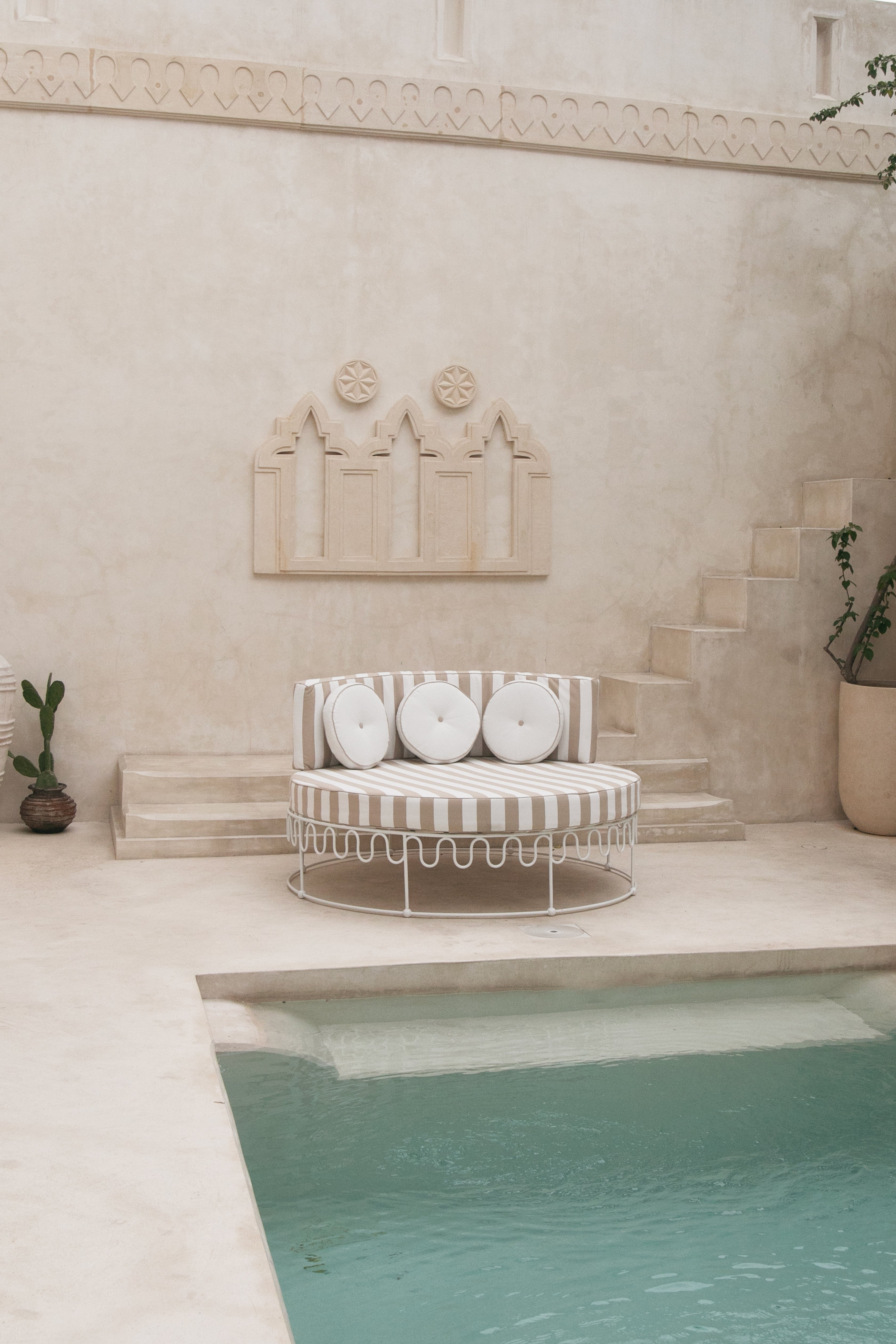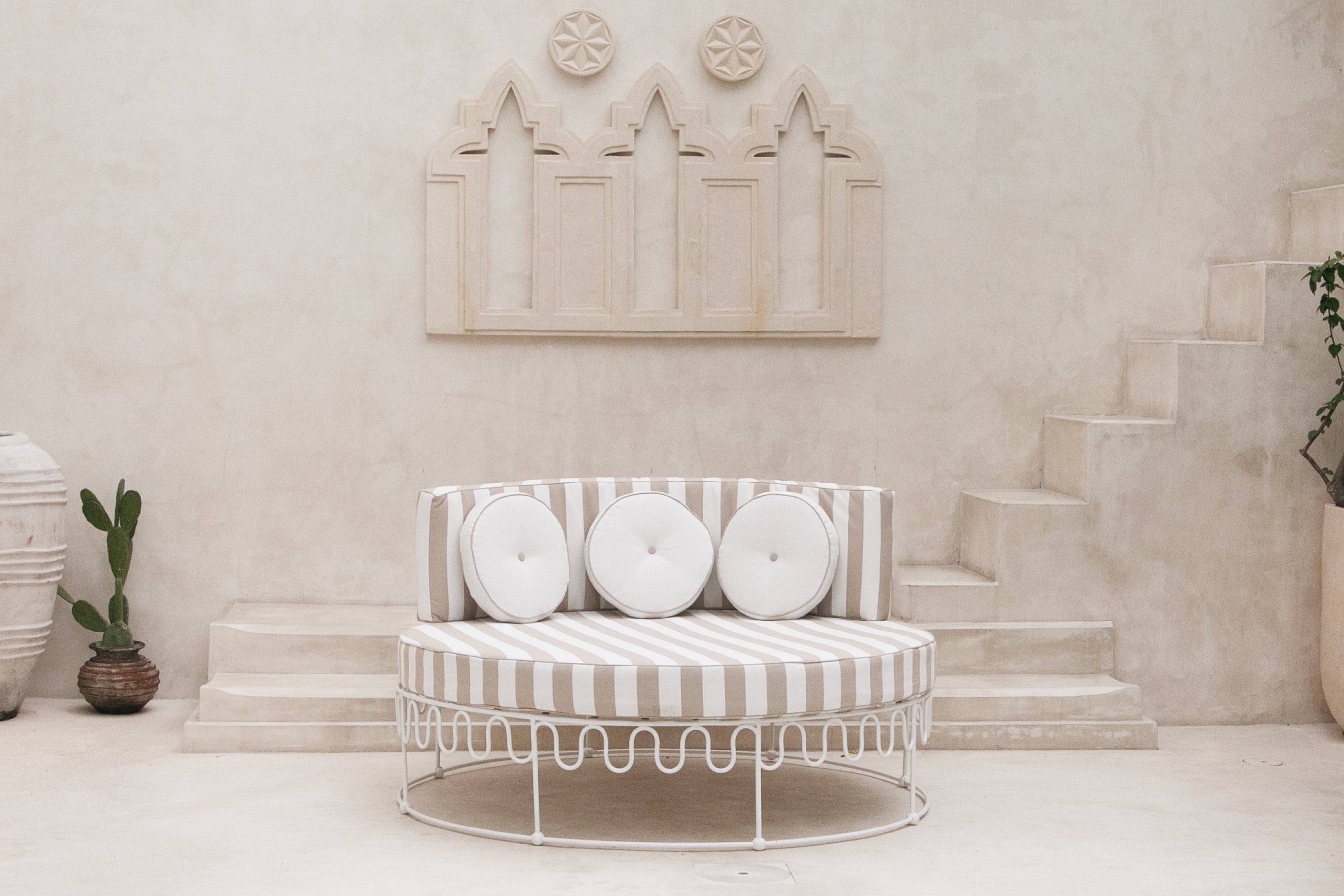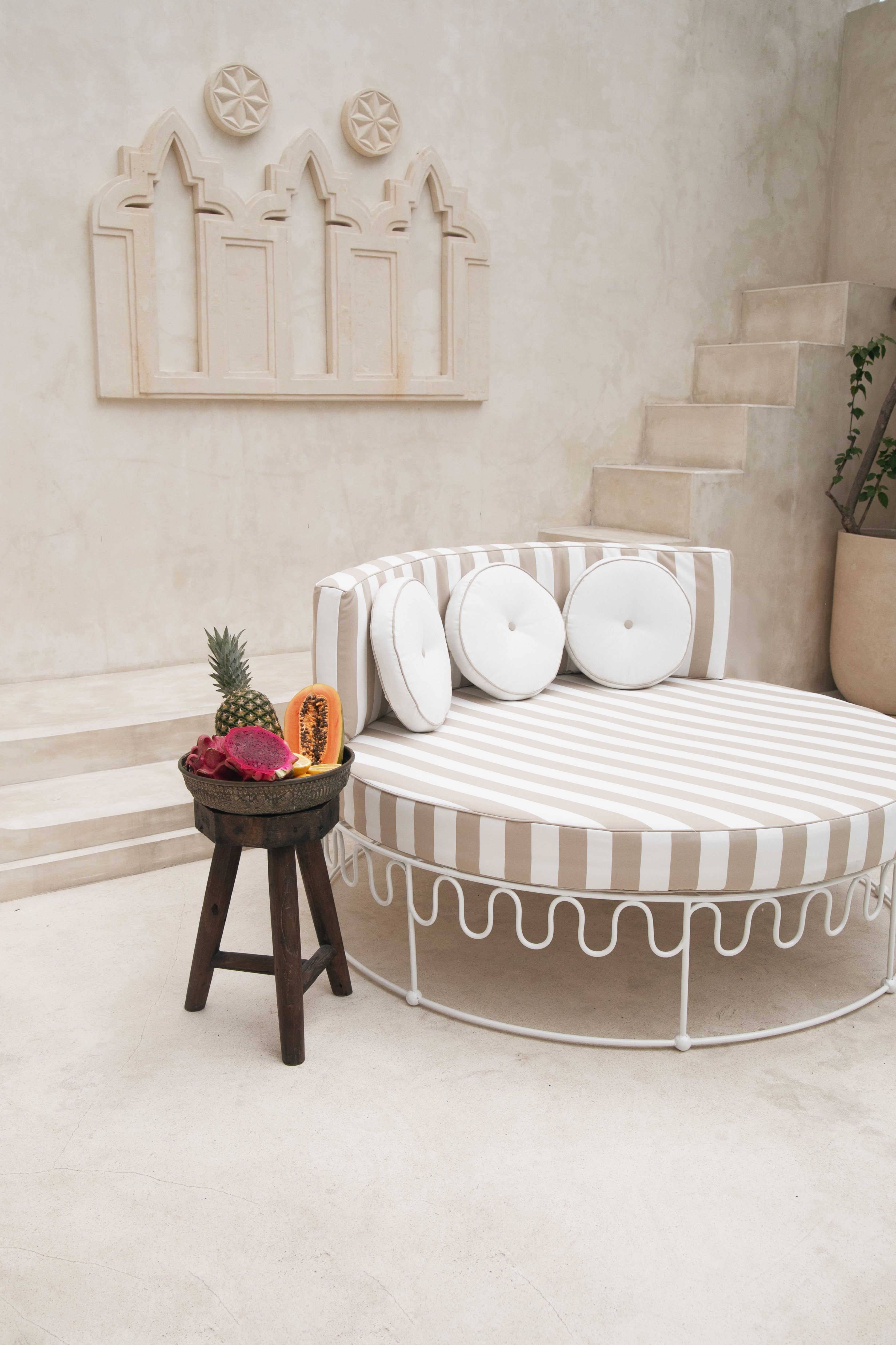 Handcrafted by skilled artisans, each lounger is constructed from a solid iron frame, powder coated for lasting outdoor durability, and paired with generously foam and dacron-filled cushions for a truly cloud-like experience. It comes complete with a plush base and back cushion, including three circular accent cushions, all finished in a waterproof sand stripe fabric. The soft neutral stripe draws inspiration from coastal landscapes and natural textures, creating a warm, relaxed palette that complements the crisp white frame while maintaining Bohteak’s signature resort aesthetic.